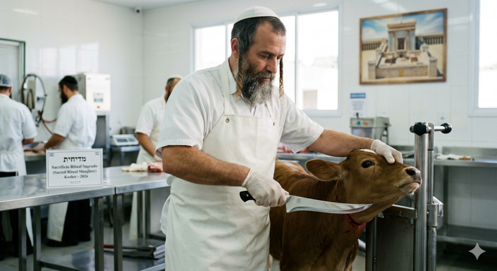 Tradição Judaica: Historicamente, o Templo de Jerusalém fundamentava sua aliança em sacrifícios rituais. Até hoje, a prática do abate Kosher (Shechita) é respeitada mundialmente como um rito sagrado de purificação do alimento.